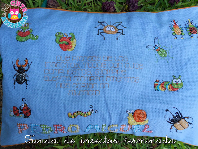 15. Me encantó la cataria (aquí mariquita) y el gusano con lentes aunque poco fotogénico, la entrada sencillamente espectacular, me imaginé a tu hijo eligiendo los insectos, creo que PM tiene unos papas que se preocupan por su valores y eso me encanta!!! Muy bella la entrada y la funda, la gama de azul no me gustan mucho pero en este bordado quedo espectacular.