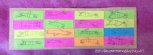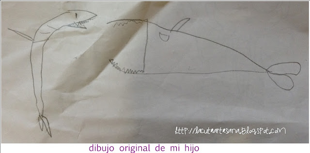 Como verán el bordado es un dibujo de mi hijo. Esta idea me la dio Luz Carmona (a quien le debo también esta técnica), ella tiene unas obras de arte de sus hijos y desde entonces la idea me cautivó. Pero en ese entonces mi hijo no hacíua dibujos muy buenos, estaba muy pequeño. Pero este año ha desarrollado ungusto particular por dibujar tiburones, en todos los tamaños, en todas las situaciones. Y la verdad es que sí me gustan, no es nada más por seguirle el rollo. Tan me gustan que estos que dibujó en pequeños pedacitos de hoja de color los pegué en cartón y los forré con vinílico y es mi separador de libros favorito.