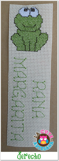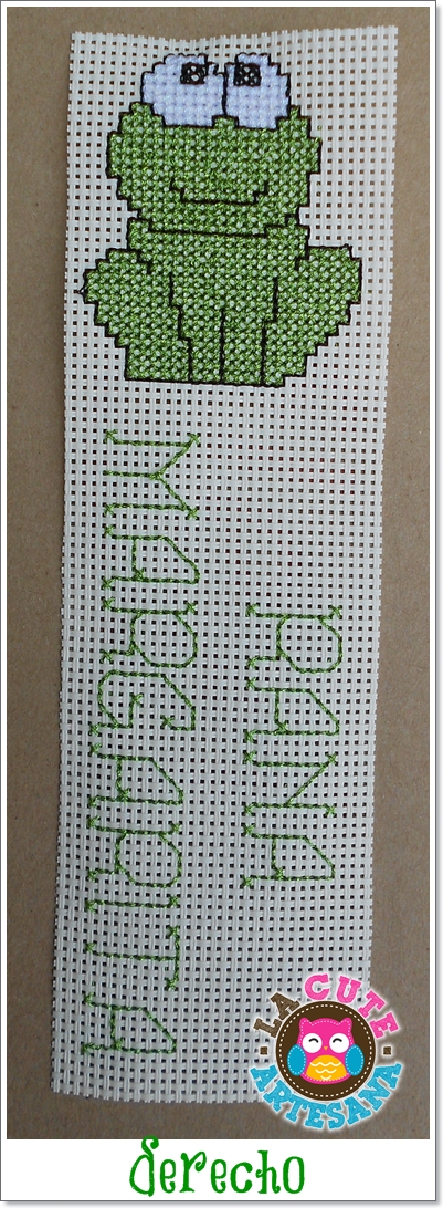 Separador bordado en punto de cruz en cuadrillé vinílico con hilos efectos luminosos de DMC. Me lo habían pedido hace un siglo, pero no me llegaba la inspiración, hasta que me encontré con esa ranita buscando en google. Segun yo es de facilisimo.com. De todos modos se las comparto más abajo. Me llamó la atención este diseño porque al ponerlo en un libro la ranita queda como asomada veanlo más abajo, hicela prueba en el libro que estaba leyendo (el primero de Saramago que leo en mi vida y aun no se si el último).