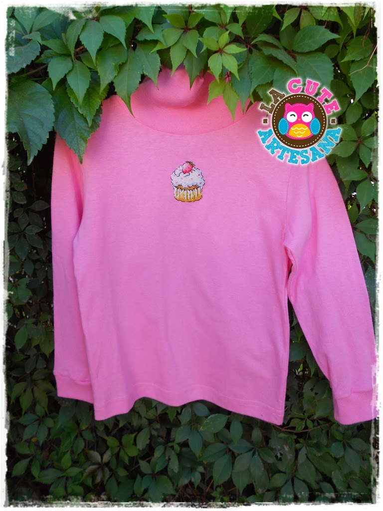 Esta rosa obvio no la compré para mi hijo jiijij sino que la elegí para bordarla también y regalarsela a una de sus compañeritas del kinder que es hija de la maestra, ay qu etener contenta a la maestra (al menos eso espero hacer) su cumpleaños  fue en enero y este fue el regalo. Lo bordé durante las vacaciones, es de los mismos que le hice en el mandil de mi mamá, bueno pues era el cupcake que me faltaba por hacer, ya ven que me gusta bordar las colecciones completas. Aunque la blusa es rosa no meparece que compita con la fresita.