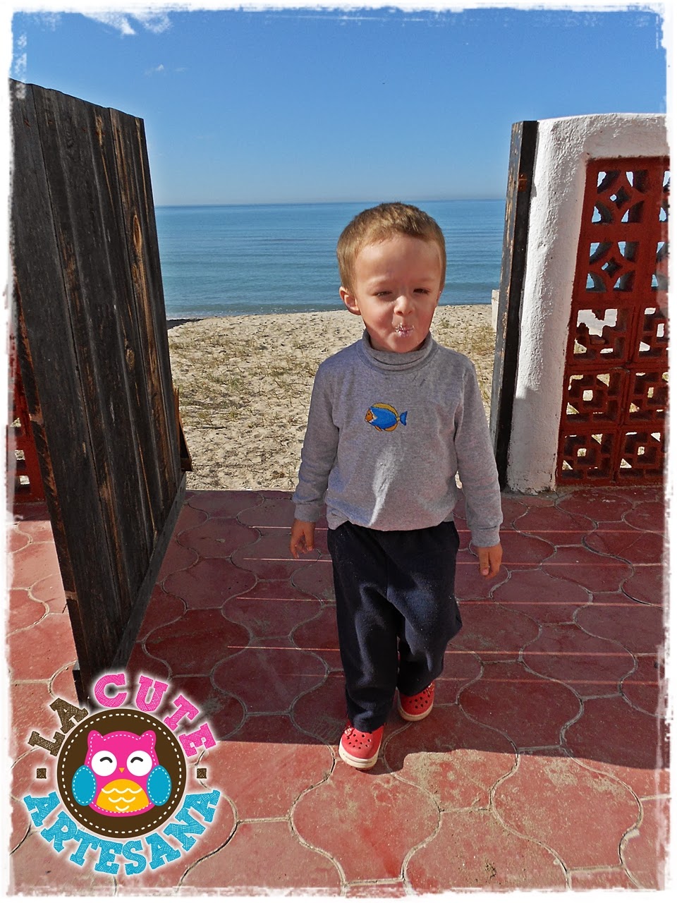 No tengo una foto de la niña de la maestra pero si de mi hermoso modelo un día en la playa, quiso su camiseta de pez porque iba al mar. Y no no está haciendo boquita de pez se está comiendo todo un paquete de donitas glaseadas el tragón!