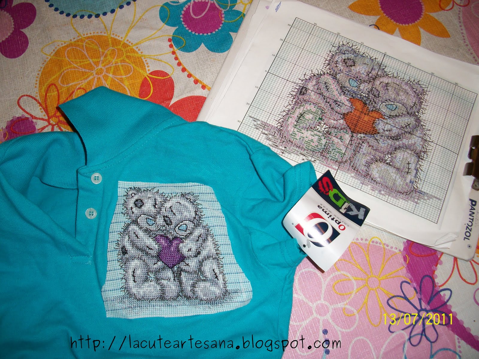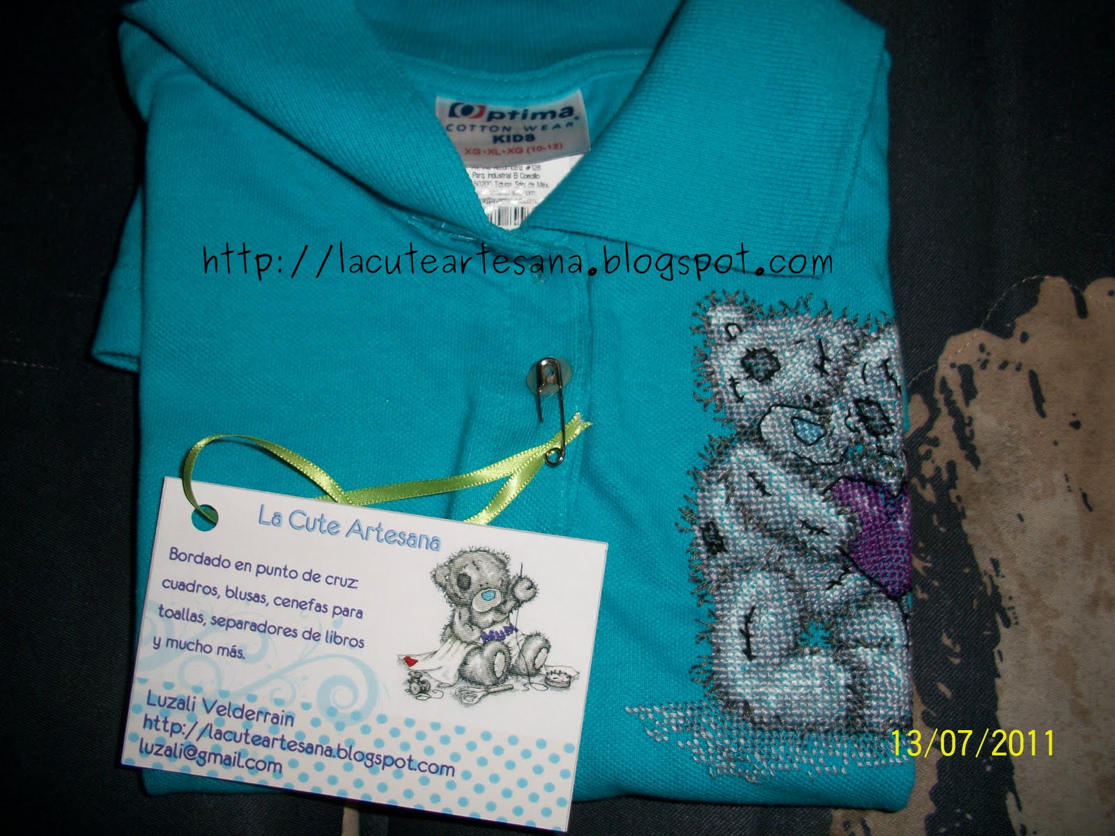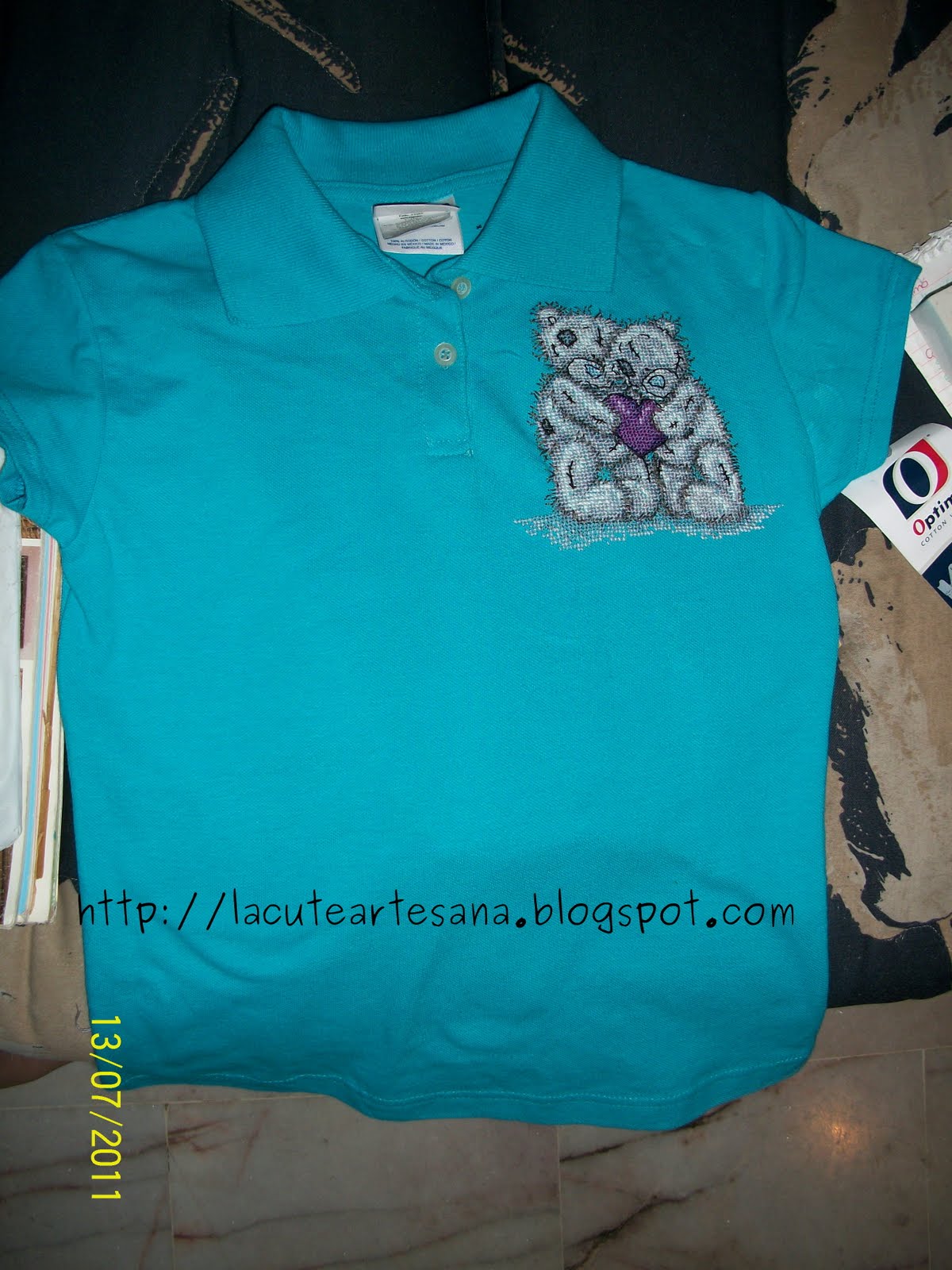 Playera tipo Polo de niña talla 8 en color azul turquesa con delicada mucñequita bordada a mano en punto de cruz. Su costo: $180 pesos mexicanos (precio válido hasta ocubre del 2012). La playera se puede personalizar del otro lado con el nombre de la niña bordado el letras rosas o amarillas.